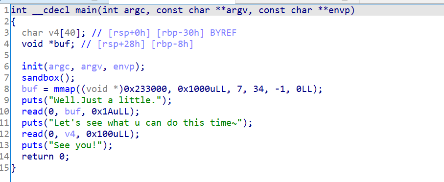 通过看代码我们发现它先在0x233000申请了一个大小为0x1000的可读可写可执行的区域,然后第一个read往这个区域读入,第二个read是栈溢出,原本一个很简单的思路,写一个shellcode,然后栈溢出把返回地址改成shellcode这边,但是因为开了沙箱