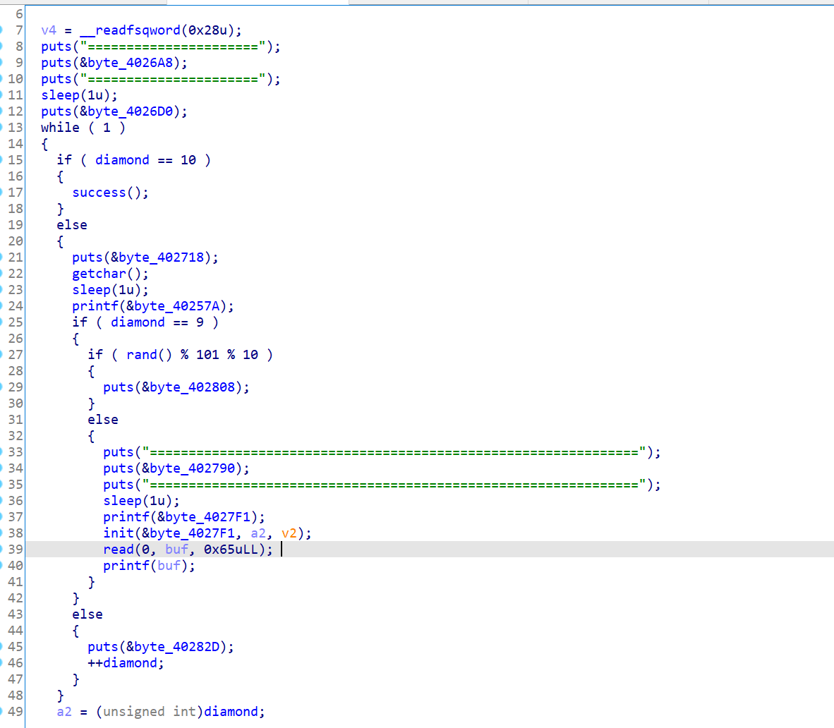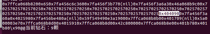 39行和40行这边有个格式化字符串任地址修改,因为我们需要把diamond这个变量改成10就行了,所以一个格式化字符串任一地址改就好了