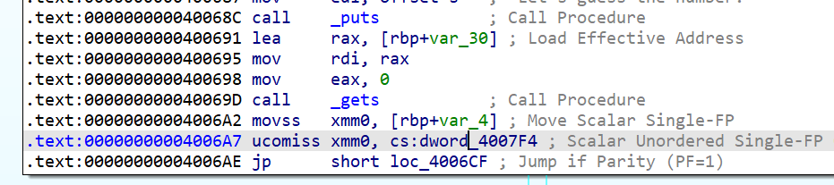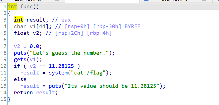 如果v2为11.28125,那么就执行system("cat /flag"),这样就可以得到flag了,然后发现v2是局部变量,在栈上,然后还有个gets的栈溢出,所以这题还是比较简单的,不过有一点就是,因为是gets,而不是读入,所以不是简简单单的11.28125,我们应该去ida里看看这个11.28125在内存应该是什么样子的,首先,我们在ida中汇编语言找到if这段对应的部分,在gets之后