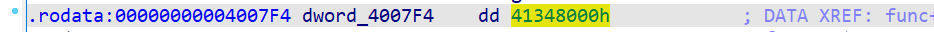 找到之后发现下面有三条汇编指令,第一条是把[rbp+var_4]里面的内容拷贝到xmm0里面,第二条就是把xmm0里的内容和cs:dword_4007f4里面的内容比较,第三条就是根据比较结果跳转不同的代码地址去执行,这个很明显就是if的作用,然后第一条的[rbp+var_4]很明显是一个栈上的内容,这个也就是代表v2,那么下面的cs:dword_4007f4就是我们11.28125存放的地址了,双击dword_4007f4查看这个里面的内容