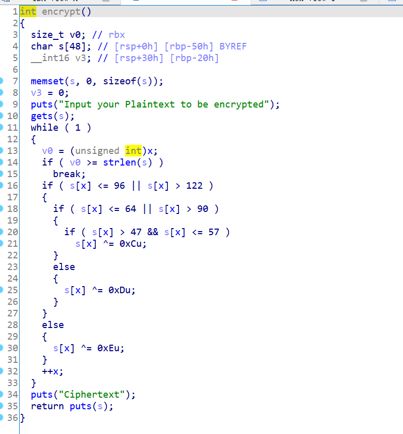 这个不错,有个栈溢出,不过那个for循环会把我们输入的数据修改,这时候我们注意到修改的长度是strlen决定的,这个函数是获得字符串长度,也就是说我们只需要字符串截断一下就行了,和之前那题一毛一样