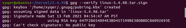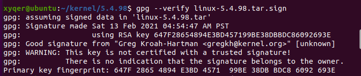 gpg --verify linux-5.4.98.tar.sign
