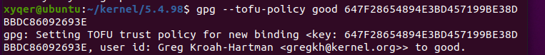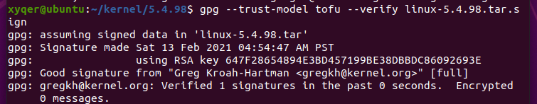 gpg --trust-model tofu --verify linux-5.4.98.tar.sign