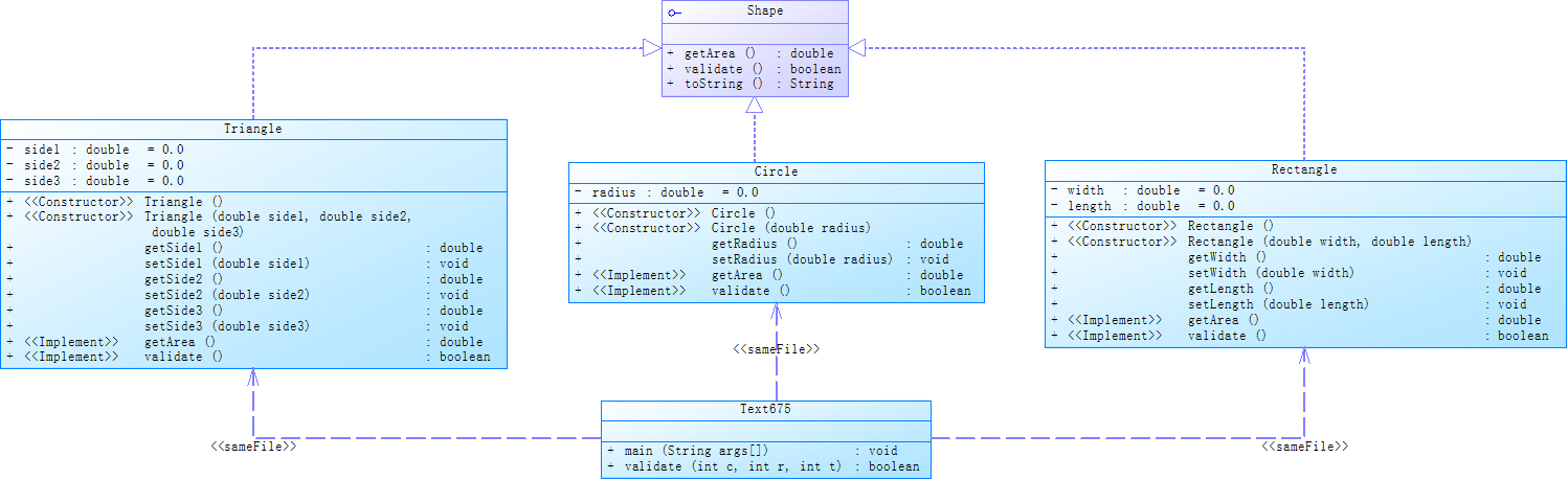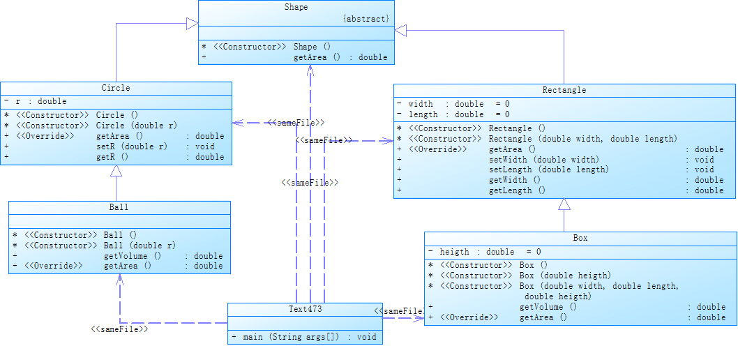 由类图可知,抽象类Shape有一个抽象方法getArea(),两个子类Circle和Rectangle继承类Shape的方法getArea()。而Circle和Rectangle子类分别为Ball和Box,Ball和Box分别对父类的方法getArea()经行了重写,好加了新的方法getVolum(),顾名思义,getVolum得到相对应图形的体积。