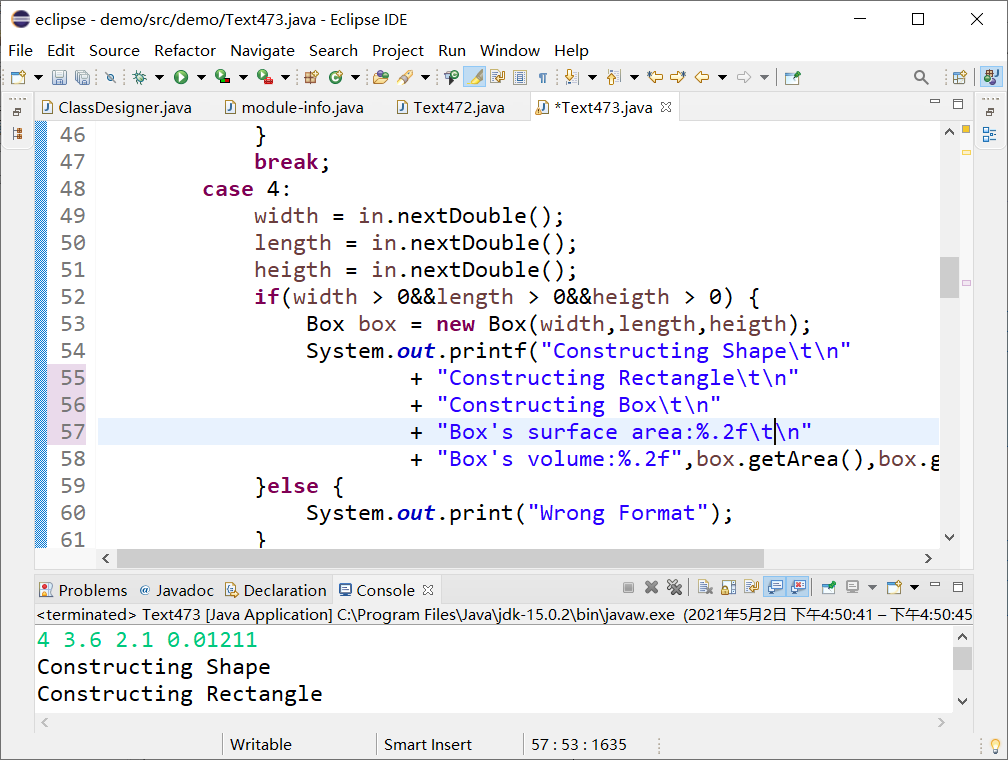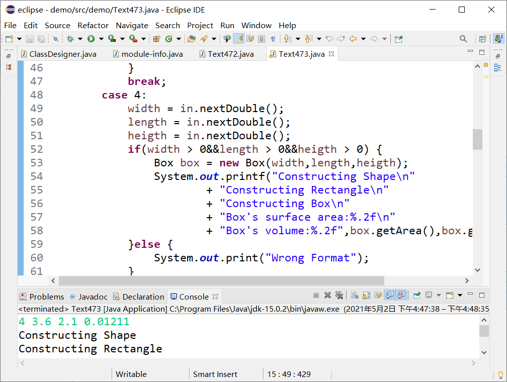 程序对Shape类、Circle类、Rectangle类、Ball类、Box类、进行了封装,Circle类、Rectangle类继承了Shape类,Ball类和Box类分别继承了Circle类、Rectangle类,还有重写这些方法。如果通过重写父类方法扩展新功能,写起来可能会很简单,但这会使整个继承体系的可复用性变得很差,特别是运用多态比较频繁时,程序很有可能会运行错误。因此我们可以对程序的设计进行进一步的改进,在Shape类中增加一个新的抽象方法getVolum(),这样Circle继承了getVolume()方法,Ball从Circle中继承了getVolume()方法。同理,Rectangle继承了getVolume()方法,Box从Rectangle中继承了getVolume()方法。因为圆是没有体积的所以,在Circle和Rectangle中getVolume()返回0。