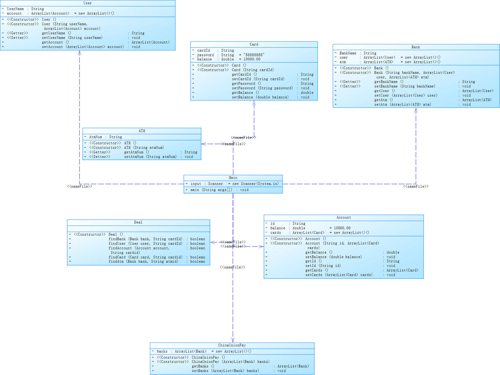 这里有我犯了一个错误,在写这道题之前,我错误的划分用户和银行的关系,在现实生活中银行和用户的关系应该是关联,而不应该是聚合,虽然在这道题上可以完美的解决问题,但是在现实生活中这样的系统是解决不了任何问题的,因为用户可以在多家银行办理银行卡,而不是像本题样,一个用户只在一个银行上办理银行卡。