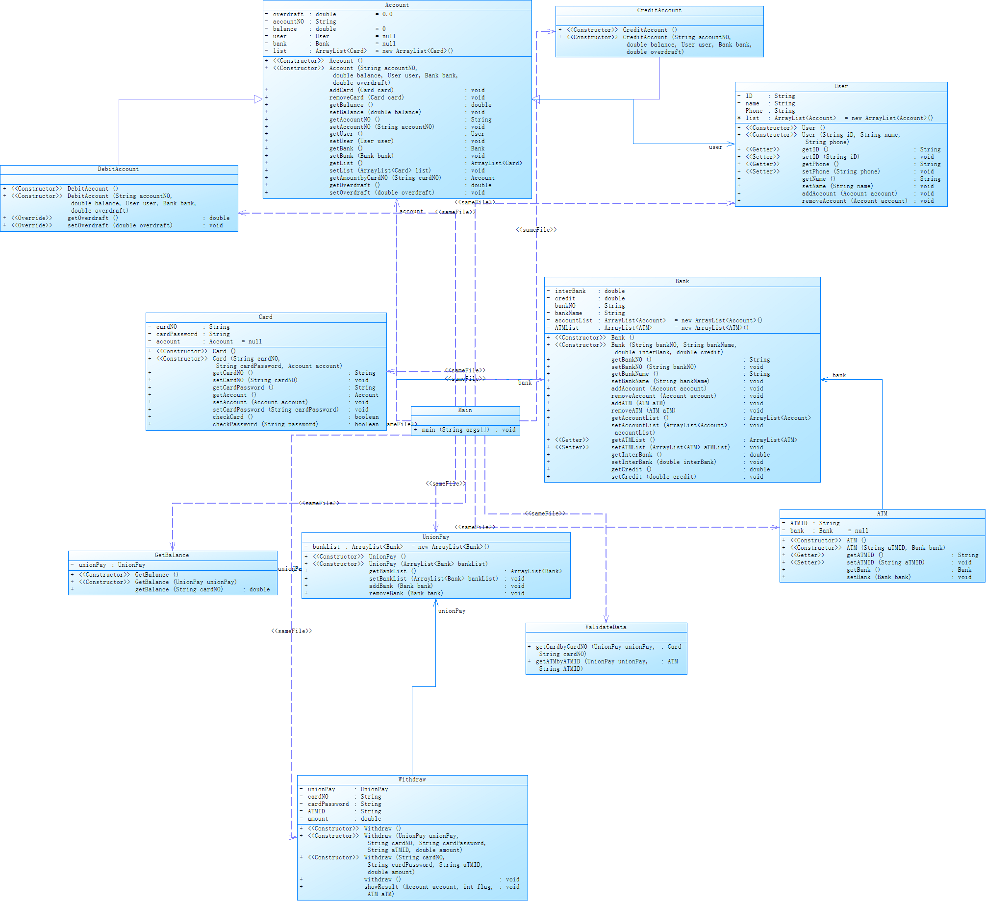 相对题目集8,题目集9对其进行了迭代,这增加了ATM系统的功能。例如,这里增加了跨行存取款的功能,并且增加信了用卡,增加跨行取款的手续费用以及信用卡透支利息。