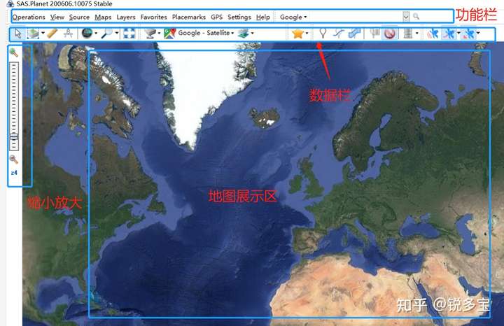 打开软件,进入界面,主要分为四个区域:地图展示区、缩小放大区、功能栏和数据栏: