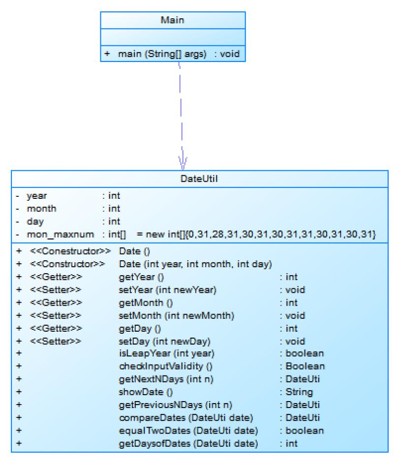 实验三7-4,这个题目同样是日期类的设计,只不过比起7-3 来说,多了求前n天,后n天,相差的日期这几个方法,要写的方法都列了出来,考察的是代码的设计。
