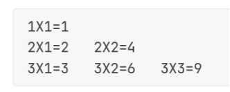 7-3这里也提一嘴,在题目实例中,九九乘法表给的是“2*3=6,3*3=9,4*6=24,5*6=30...”这种是小的在前,然后这也是我们日常的习惯嘛,就没仔细看样例,wa了一次,后面检查来检查去也没发现语法啊这些的错误,再次输入题目给的样例用来测试时,一看,感觉不对,这才发现是自己写反顺序了。
