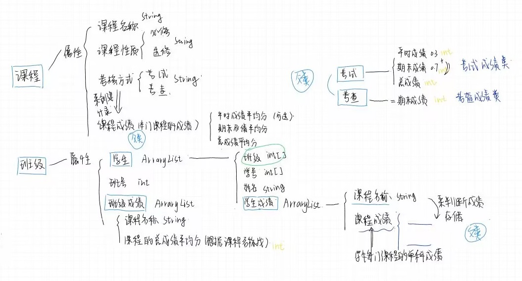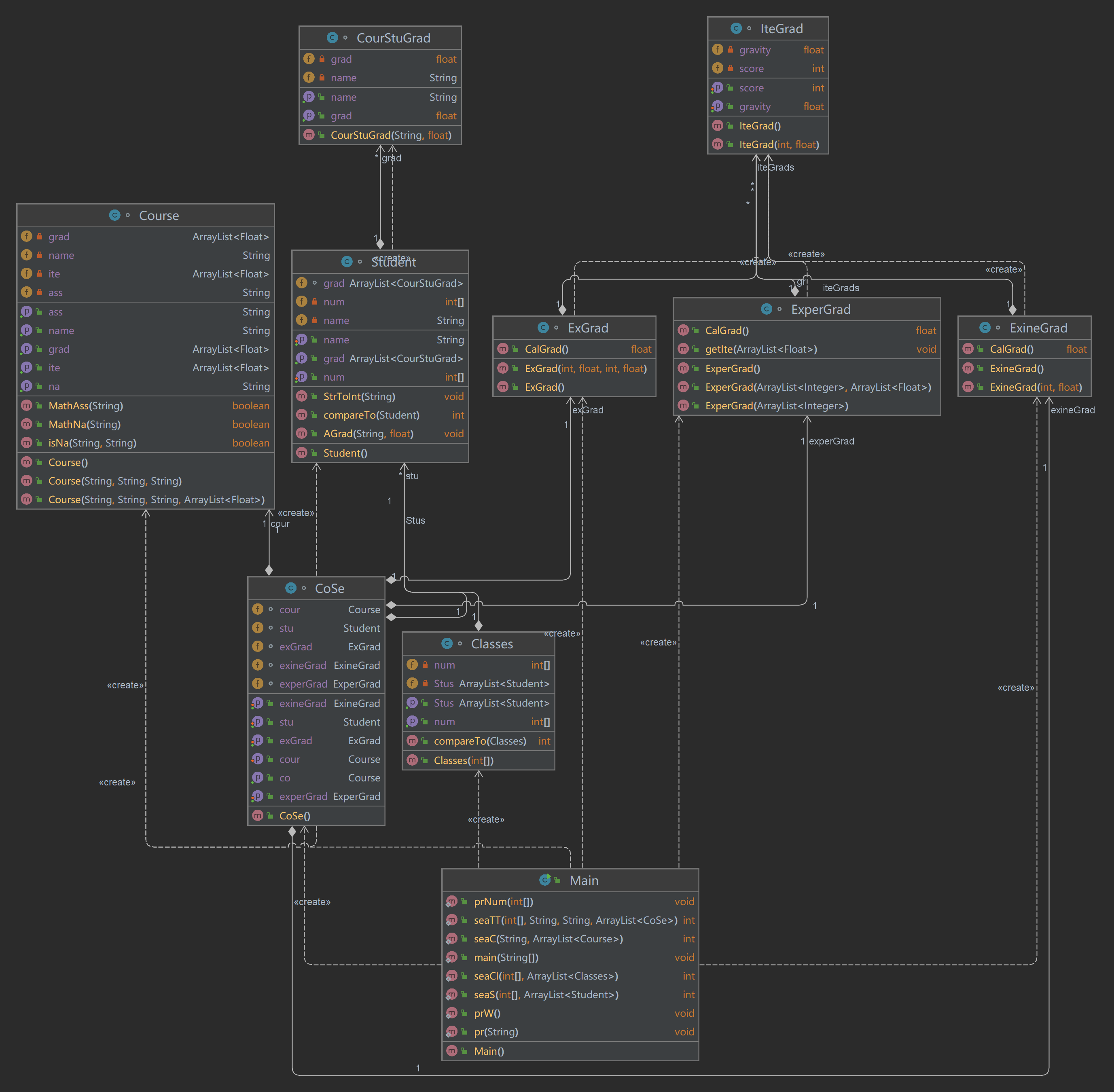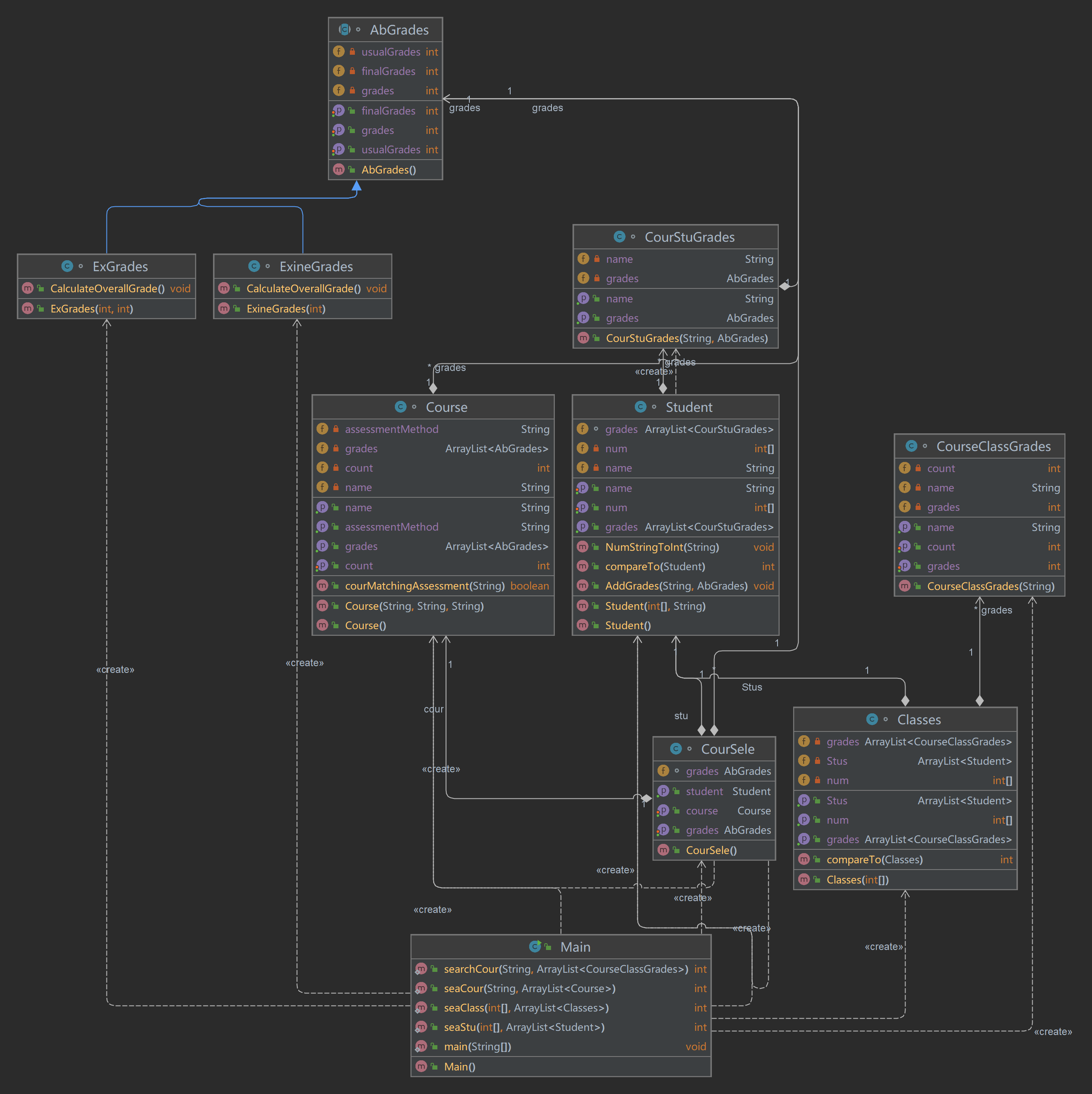 可以看出我最开始的时候是多设计了CourseClassGrades类,按照我最开始的设想,是将每个班级的每个课程成绩先分别储存起来,最后输出的时候再计算,这样的话设计就会出现CourseClassGrades类,如下: