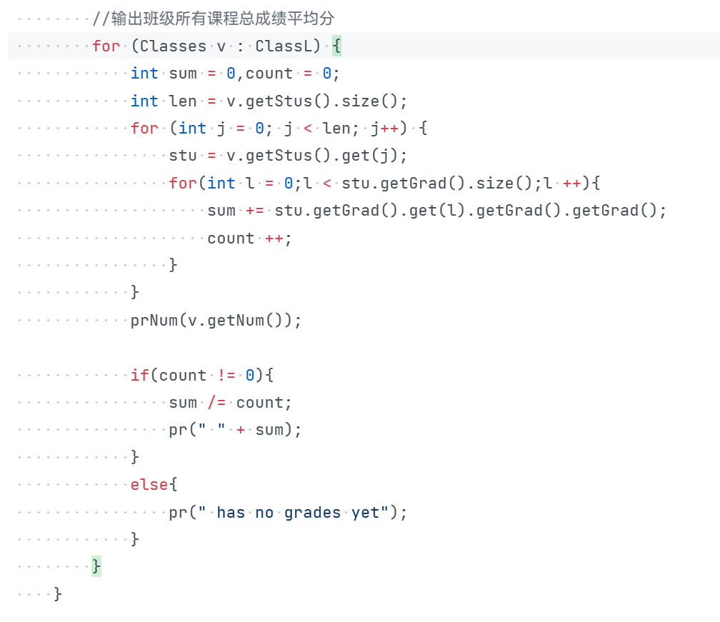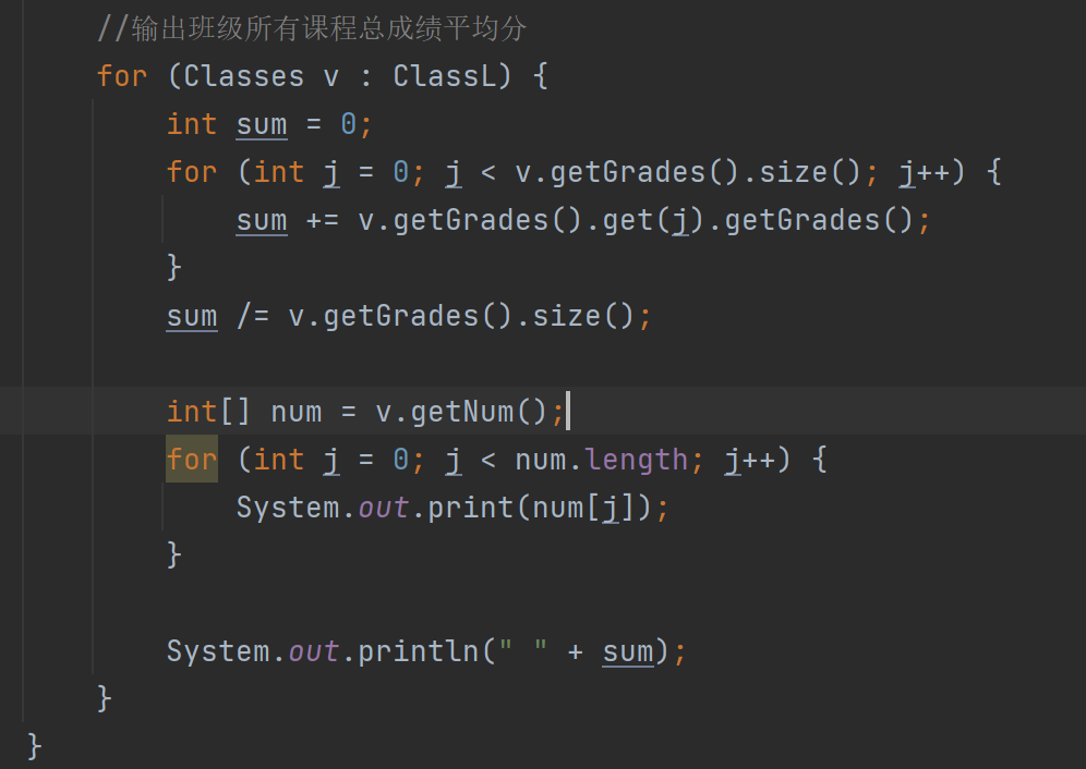 计算课程平均分的时候是一个个调用每个班级中每个课程的成绩相加算平均分,后来在和同学讨论后,发现并不是这样计算的,应该是每个同学的每个成绩相加再除以成绩个数,如下