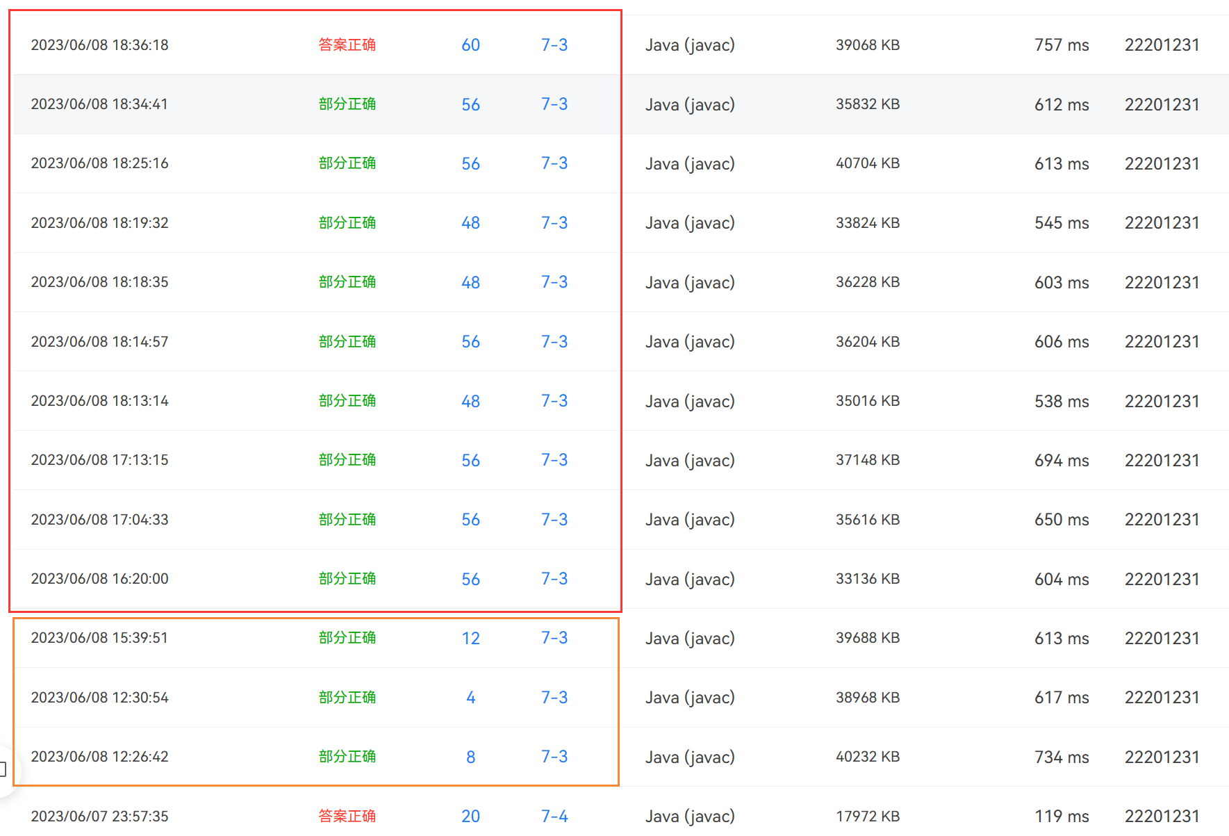 如图,其实把本次代码的框架搭好后并没有遇到什么大问题,在第四次提交时就到了56/60分,然后后面就一直卡在56分就是因为小细节上忘记将实验类的信息加上,但在不断的各种问同学和同学讨论都没发现什么大问题下,最后实在没有办法了,就自己一行行代码看了一遍,把问题给揪了出来。举个例子