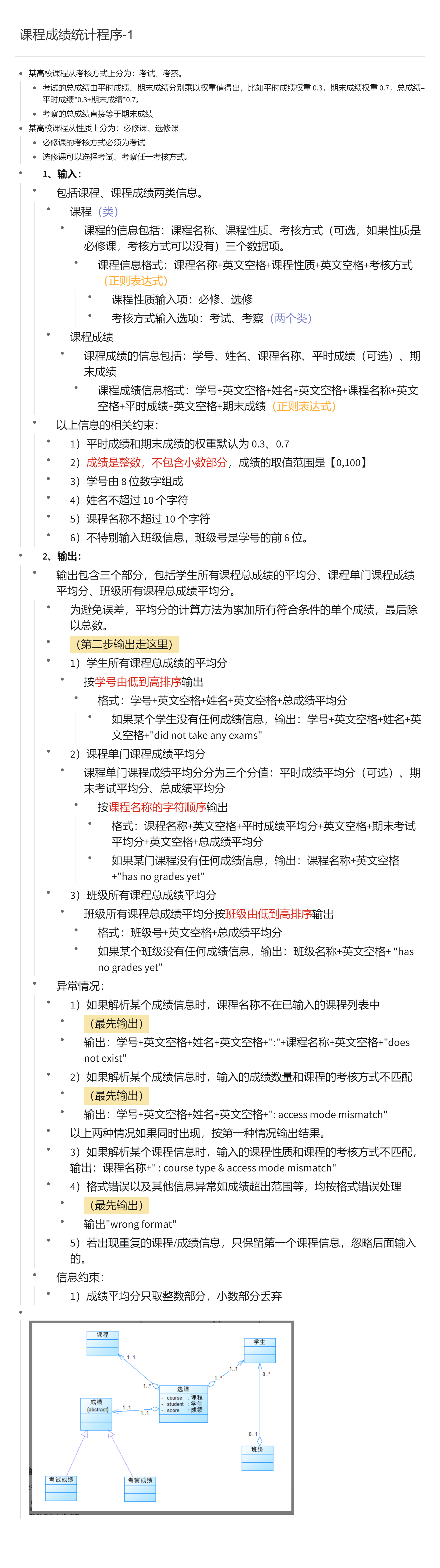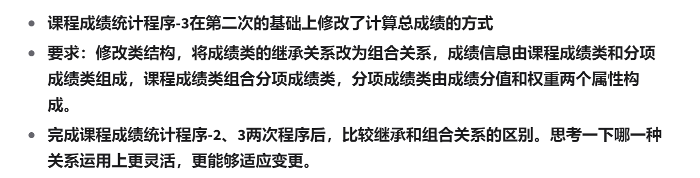 类间关系由继承变为了组合,其实一开始我是有点没有看懂他是想表达什么意思的,是怎么个组合方式有点迷迷糊糊,后来再看几遍大致懂了之后为了确保没弄错还和同学对了一下(就我也觉得自己有点离谱),其他方面的改动比如增加了权重值,从固定的权重变成了输入权重,以及最重要的计算成绩发生了变化,比之前的计算简单了许多,如下