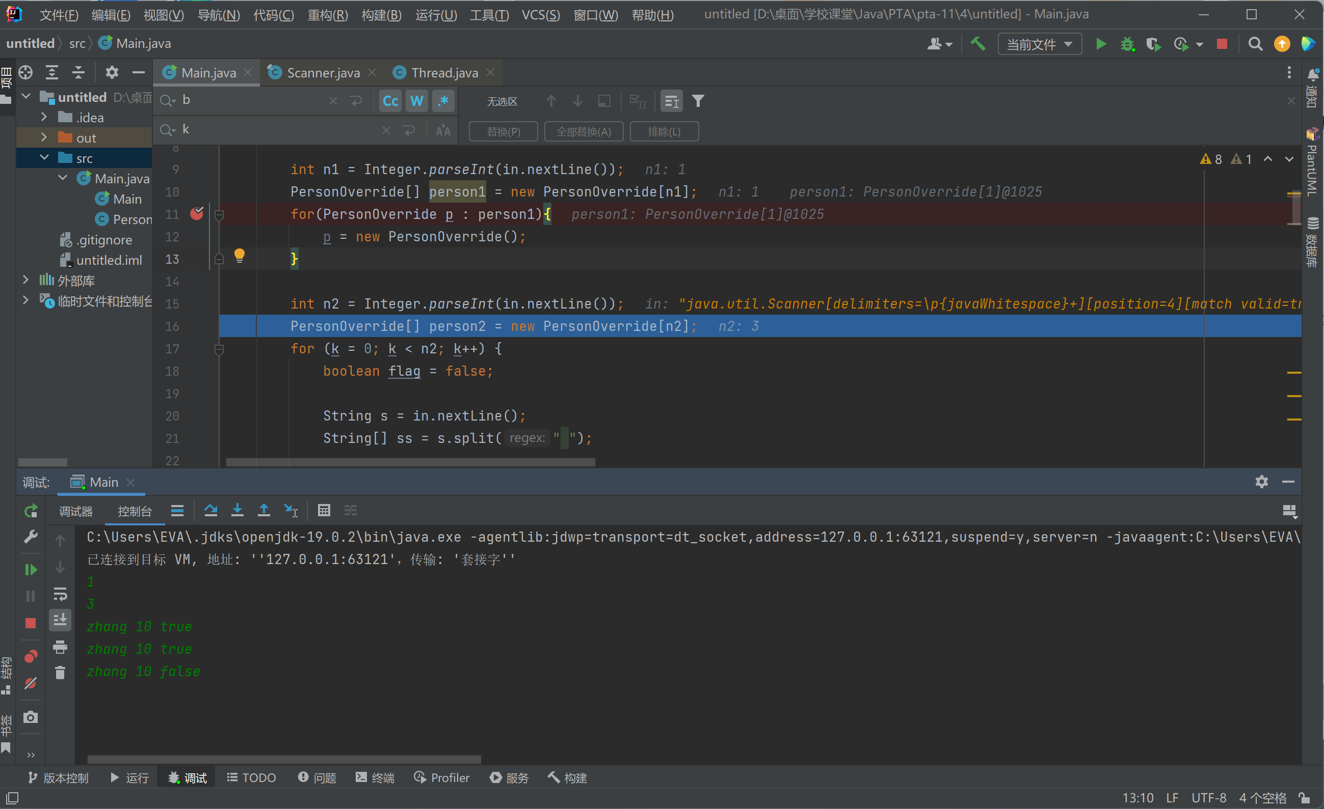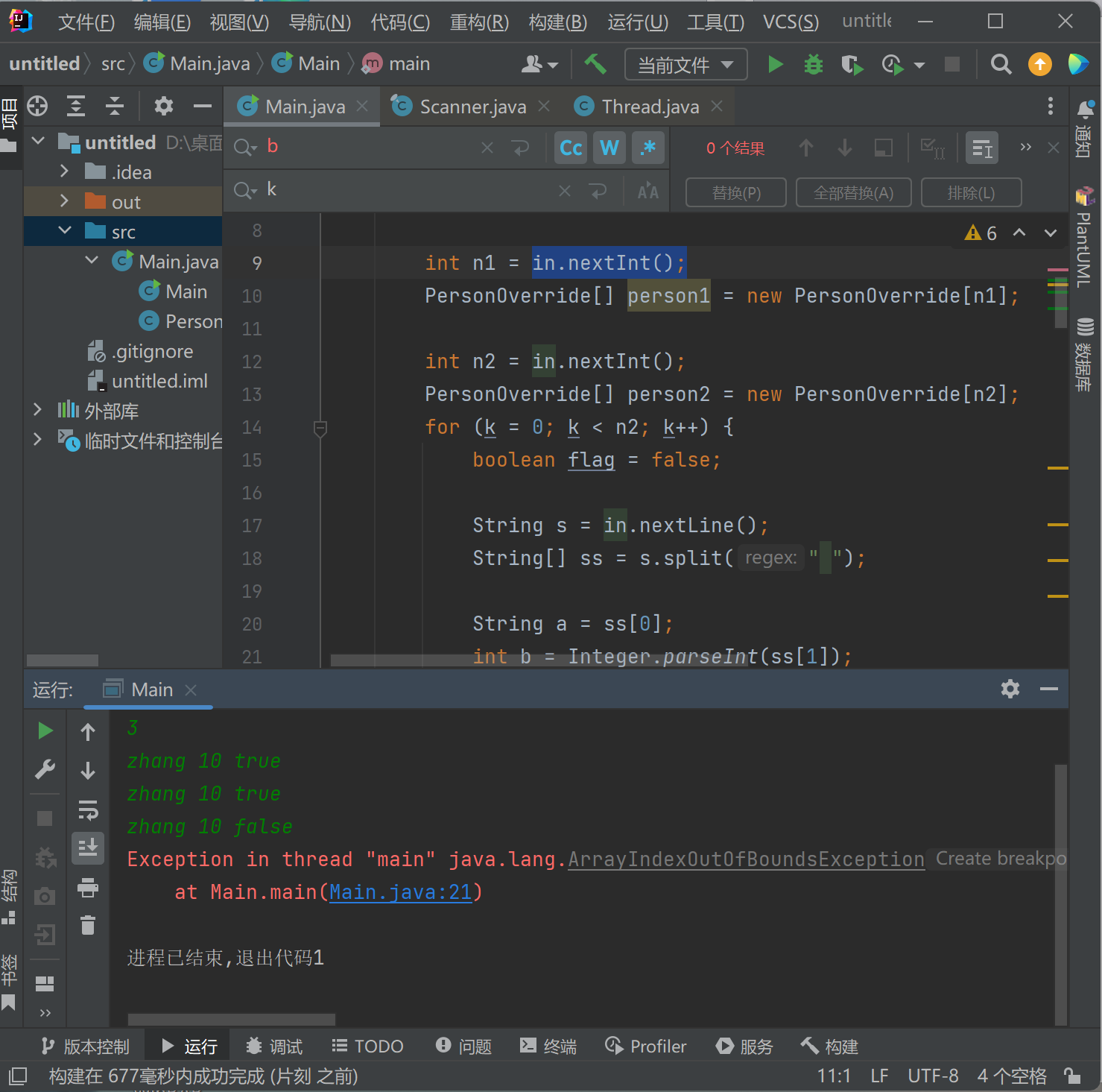 这里是因为在读取的时候(9行及以后)一直使用的是nextInt()进行读取,在行末尾的时候有一个空格没有读取到,使s(17行)在获取时的调用后就会出现报错,修改后如下:
