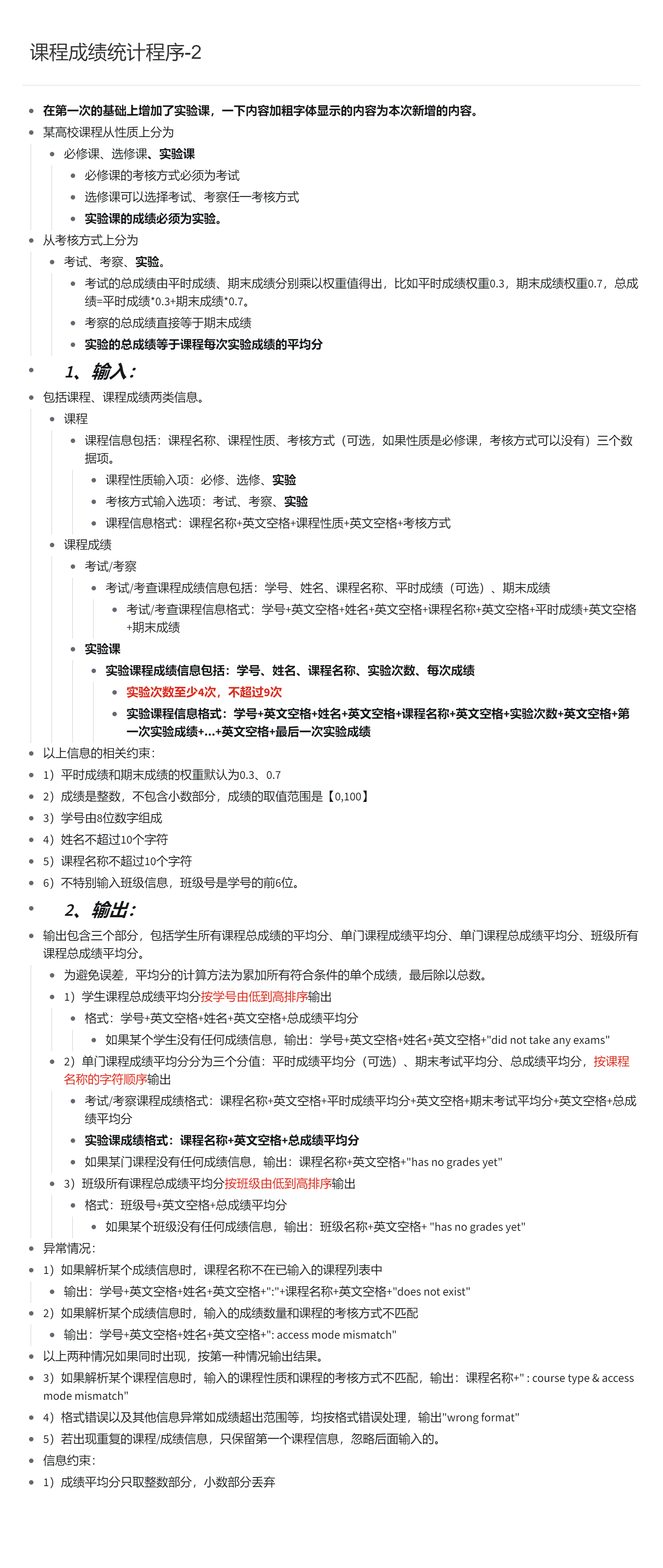 从本次题目集之后菜单类的题目迭代就告一段落了,开始了课程成绩统计的迭代,本次题量也是只有一道,是基础的题目分析以及类设计,相对的时间也不长,给了四天左右的期限。