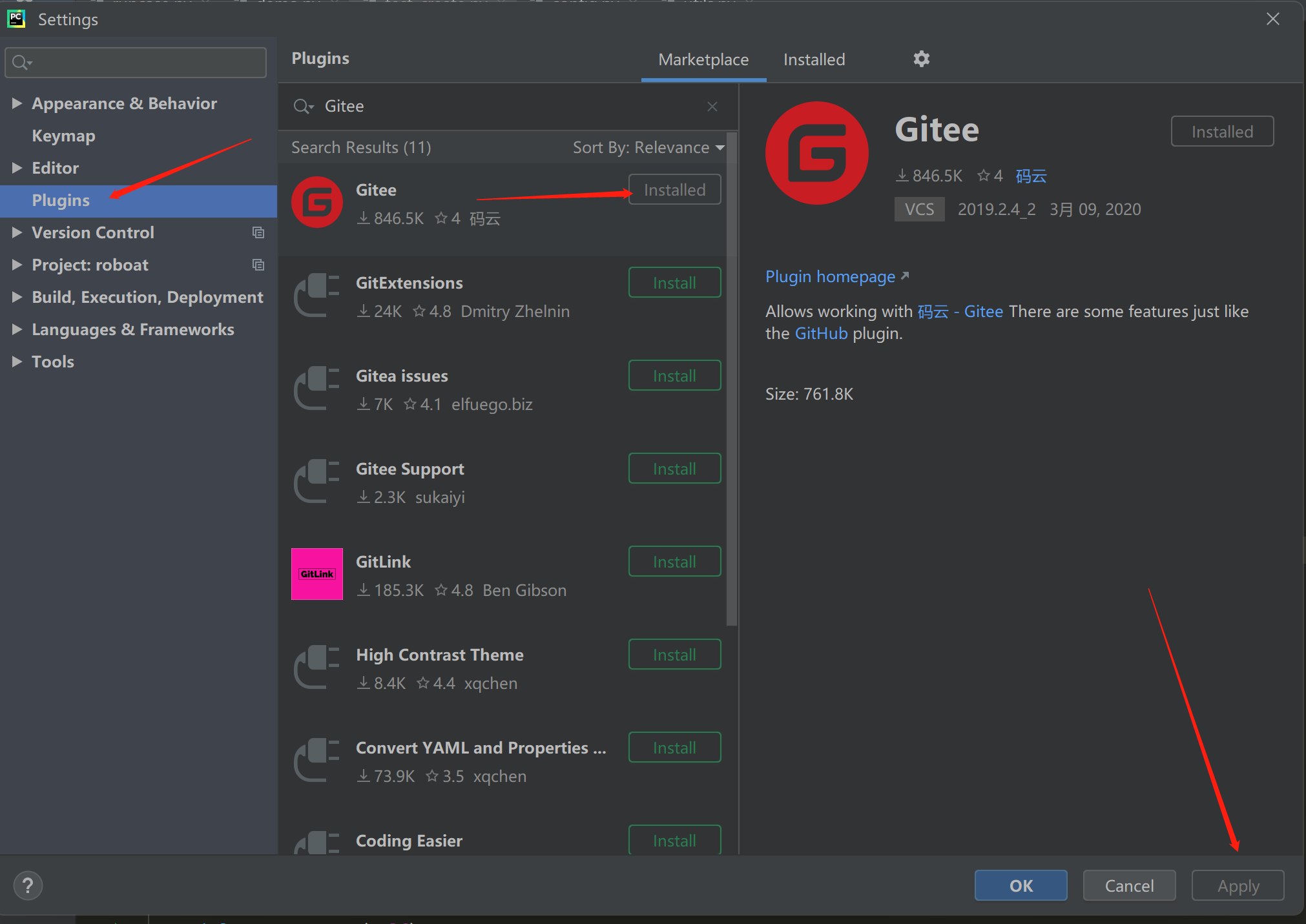 有gitee,要是没有点击plugins,在搜索框中搜索gitee安装插件