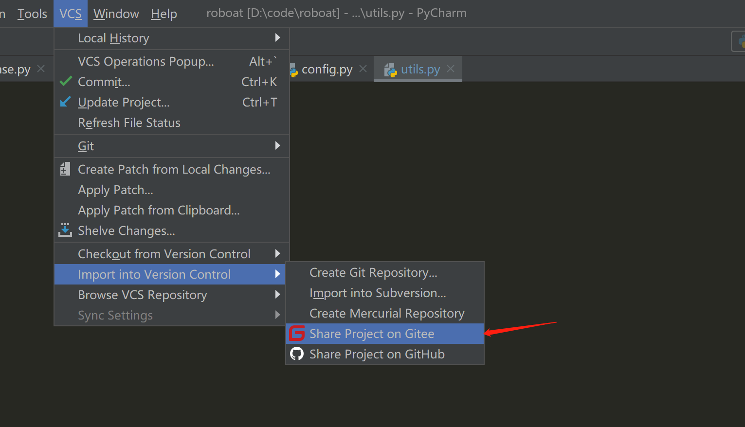 3、pycharm主界面菜单栏找到VCS,查看里面Share Project on Gitee选项,说明你已经安装成功