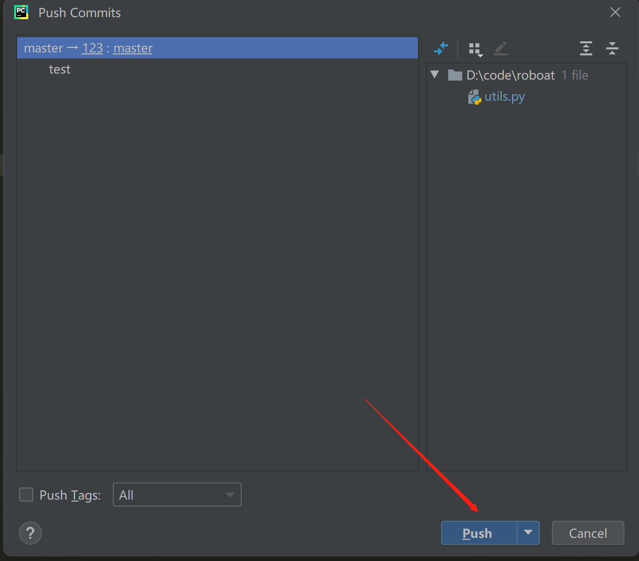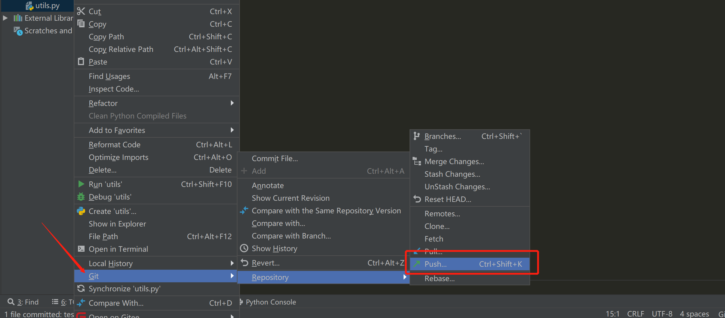 7、右键选择该文件>git>push推送到远程仓库分支上