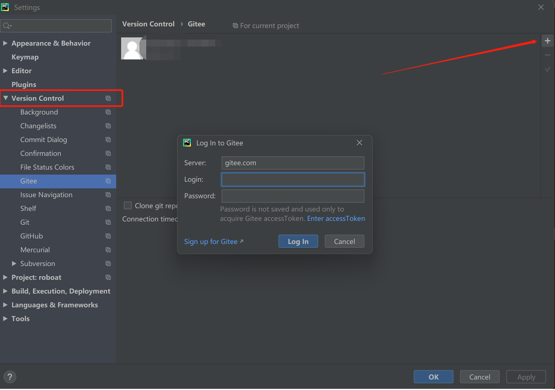 2、当前页面version control下有gitee或者下载安装成功后,点击gitee,添加要上传的gitee账号,输入完成点击登录,也可通过gitee给到token登录