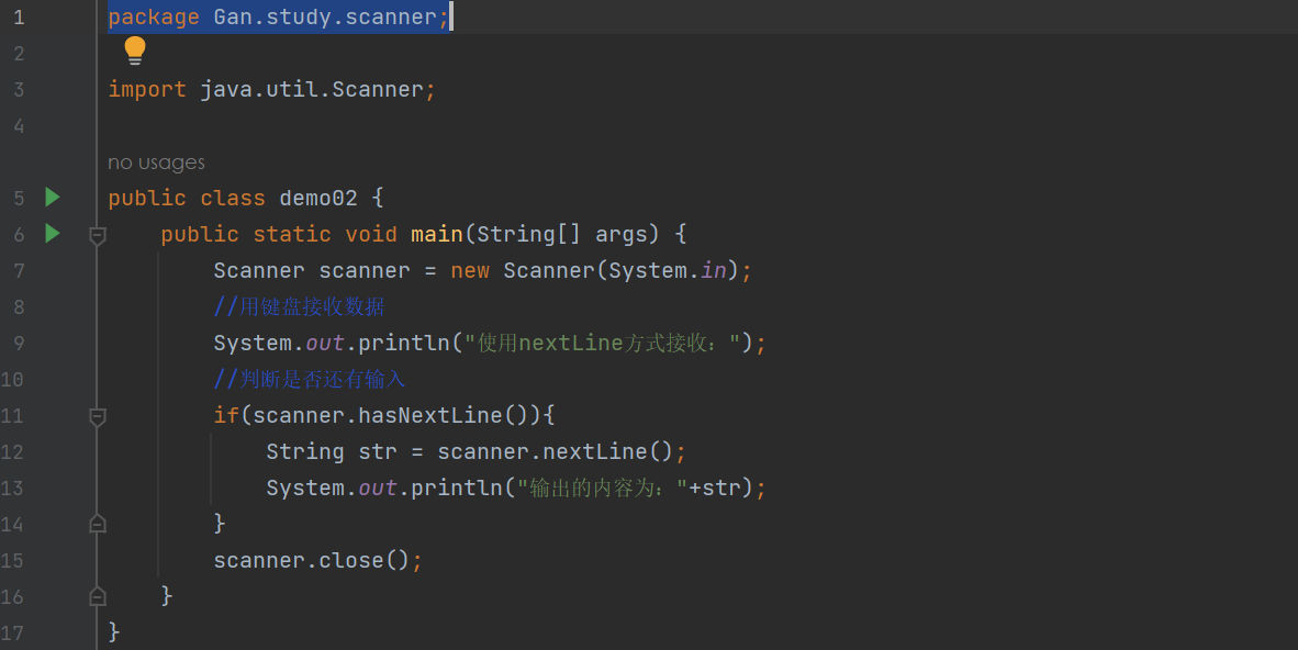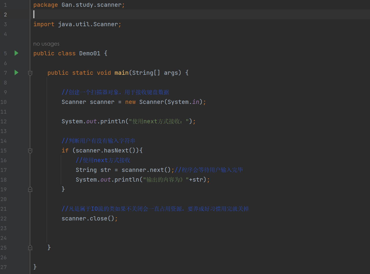 通过Scanner类的 next() 与 nextLine() 方法获取输入的字符串,在读取前我们一般需要使用 hasNext() 与 hasNextLine() 判断是否还有输入的数据。