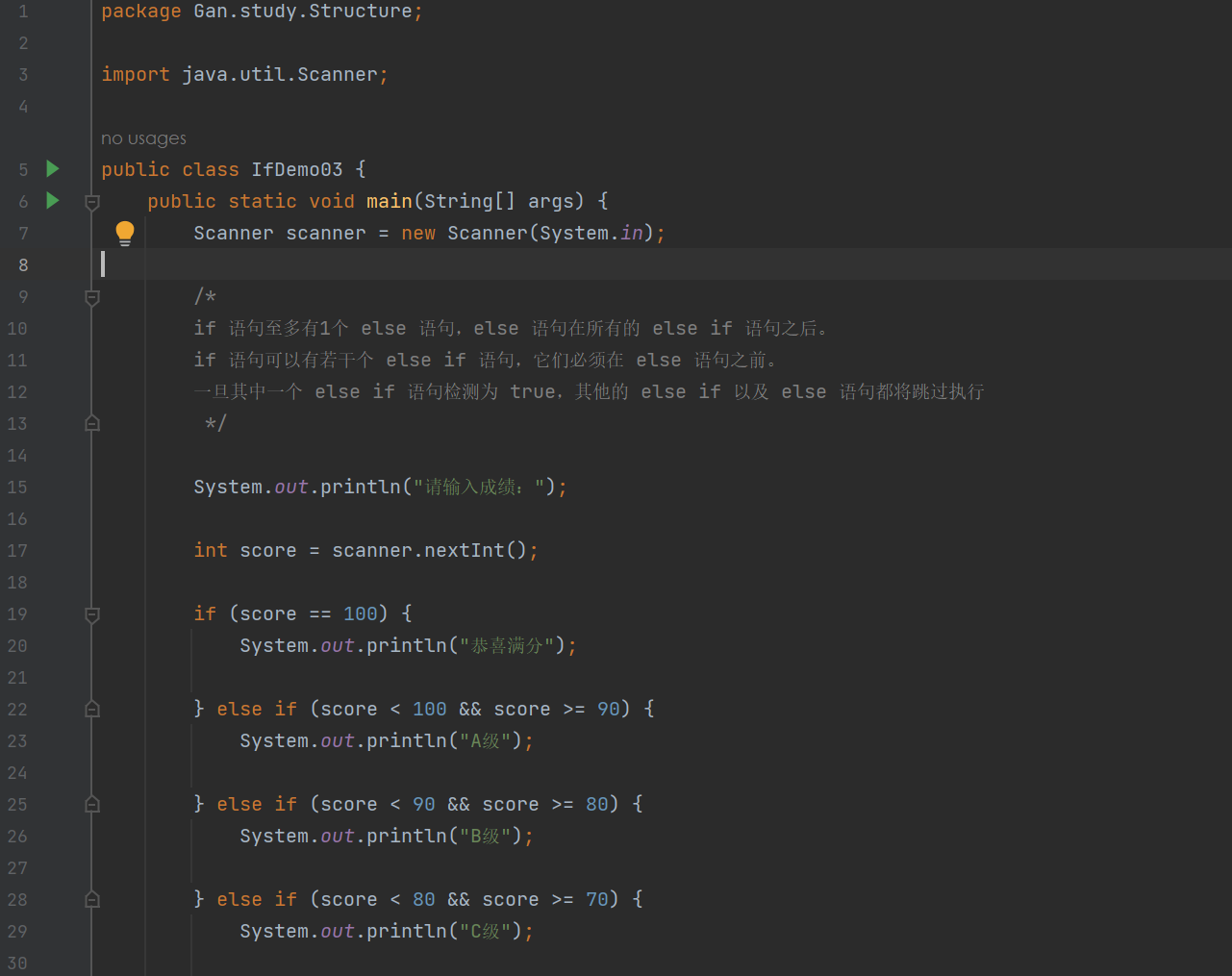 if(布尔表达式1){ //如果布尔表达式1的值为true执行代码 }else if(布尔表达式2){ //如果布尔表达式2的值为true执行代码 }else if(布尔表达式3){ }else{ //如果以上布尔表达式都不为true执行代码 }