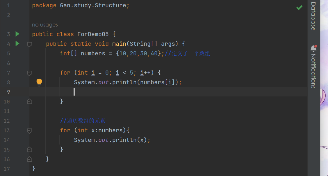 声明语句:声明新的局部变量,该变量的类型必须和数组元素的类型匹配。其作用域限定在循环语句块,其值与此时数组元素的值相等。
