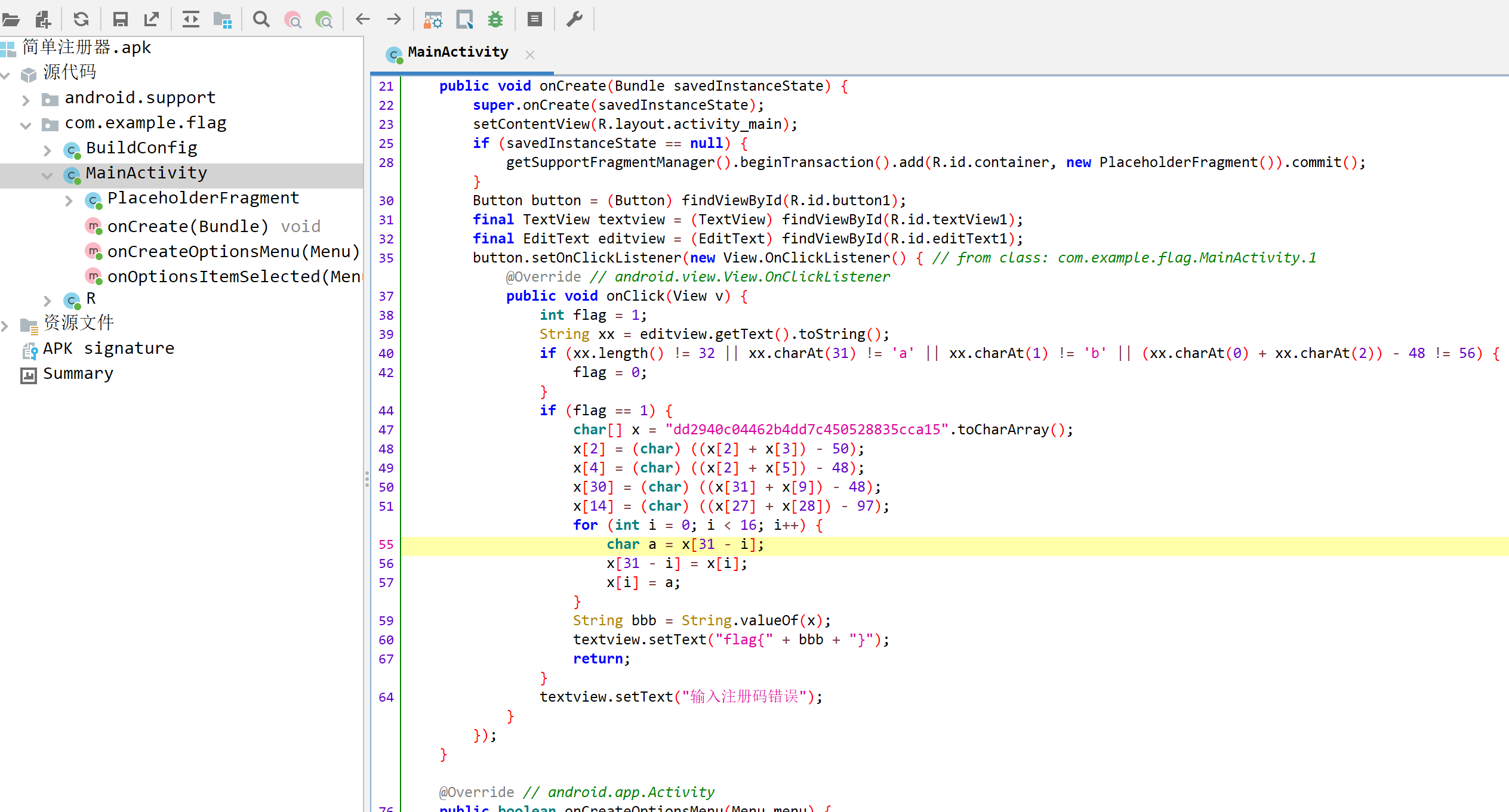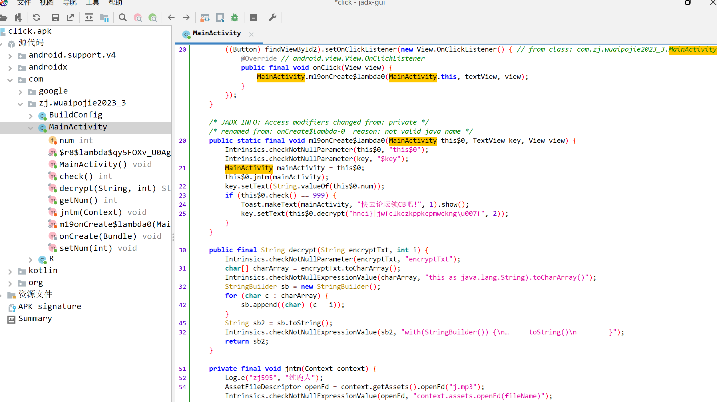 这里我们把它放进jadx-gui里面,去查看一下他的源码,找到他的main函数来分析它的源码