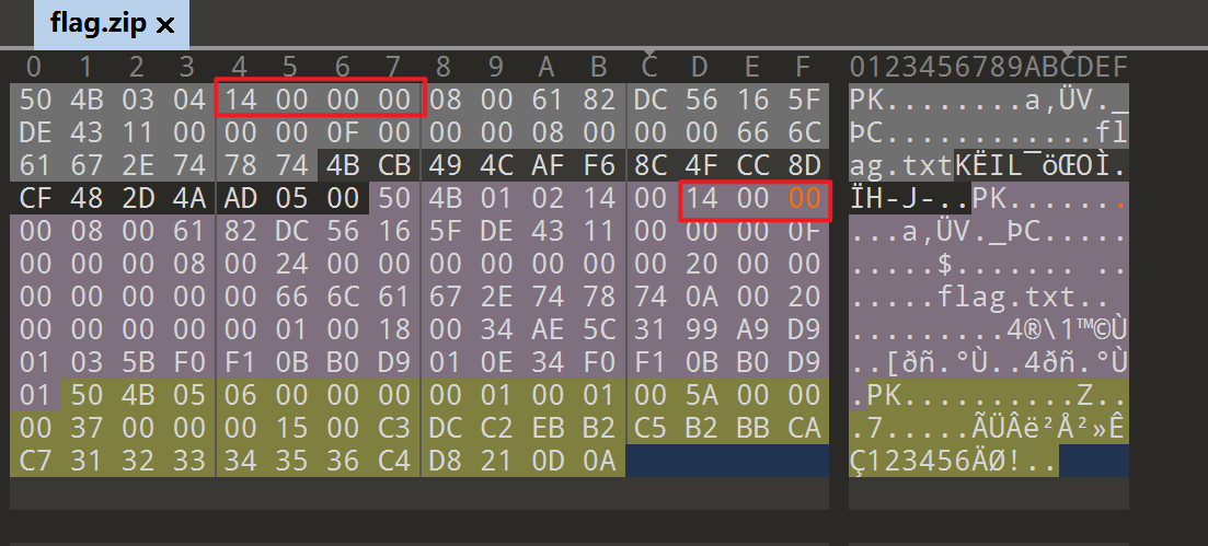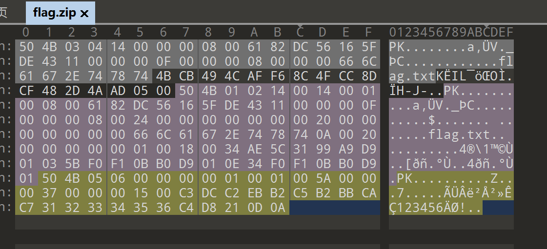 这里我们发现是压缩包的伪加密,它的标志位是偶数说明没有加密,但是flag.txt哪里的标志位是奇数,说明是伪加密,修改一下: