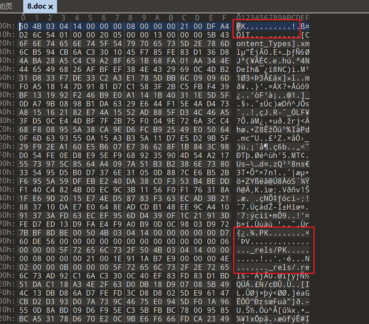 发现里面有好多PK压缩包文件,将doc的word文档后缀改成.zip,然后解压出许多文件