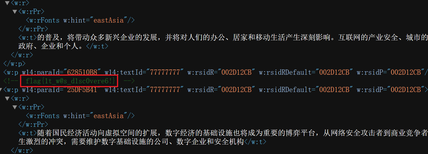猜测是word隐写,打开后全选更改颜色,显示隐藏信息,也没有发现flag