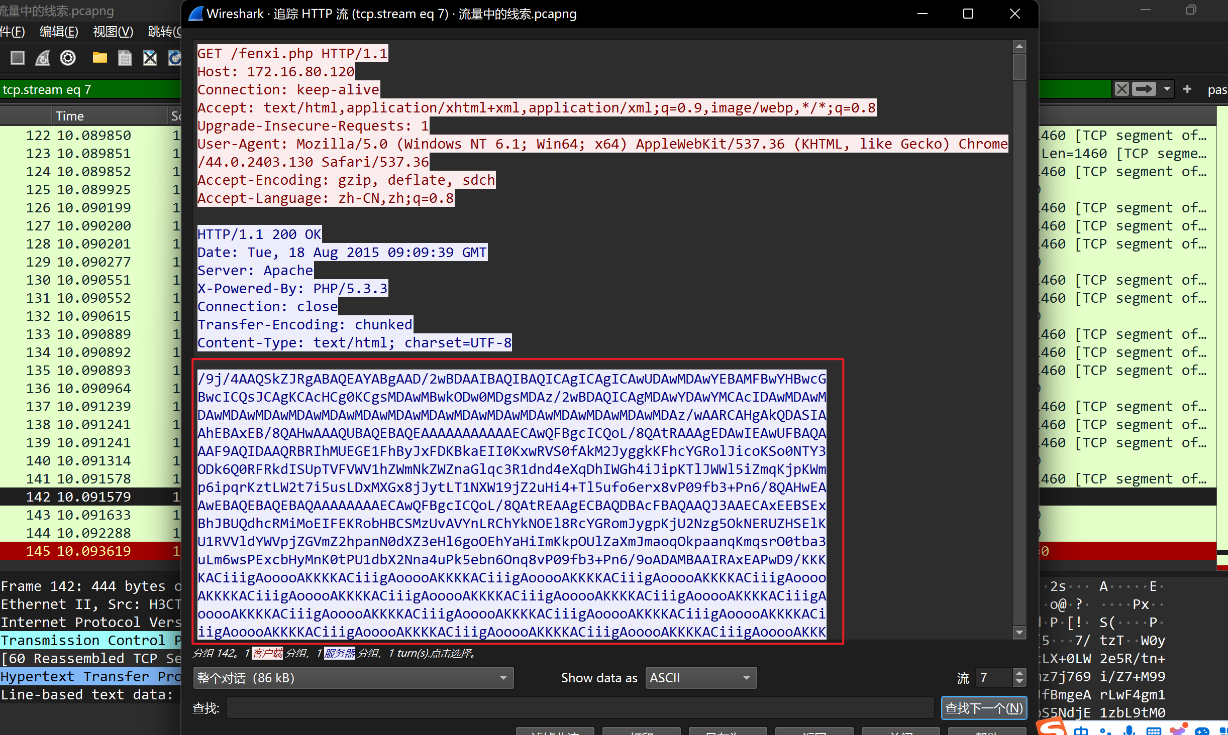 我们追踪它的http流,发现了一段类似base64的编码,但是它的编码特别多,猜测一下是base64转图片