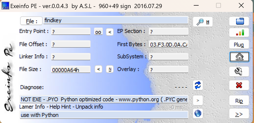 解题方法:将题目附件下载下来是一个无后缀名的文件,把他放进exeinfope.exe里查看一下它的信息