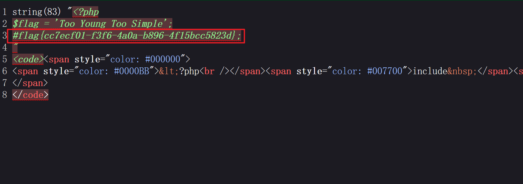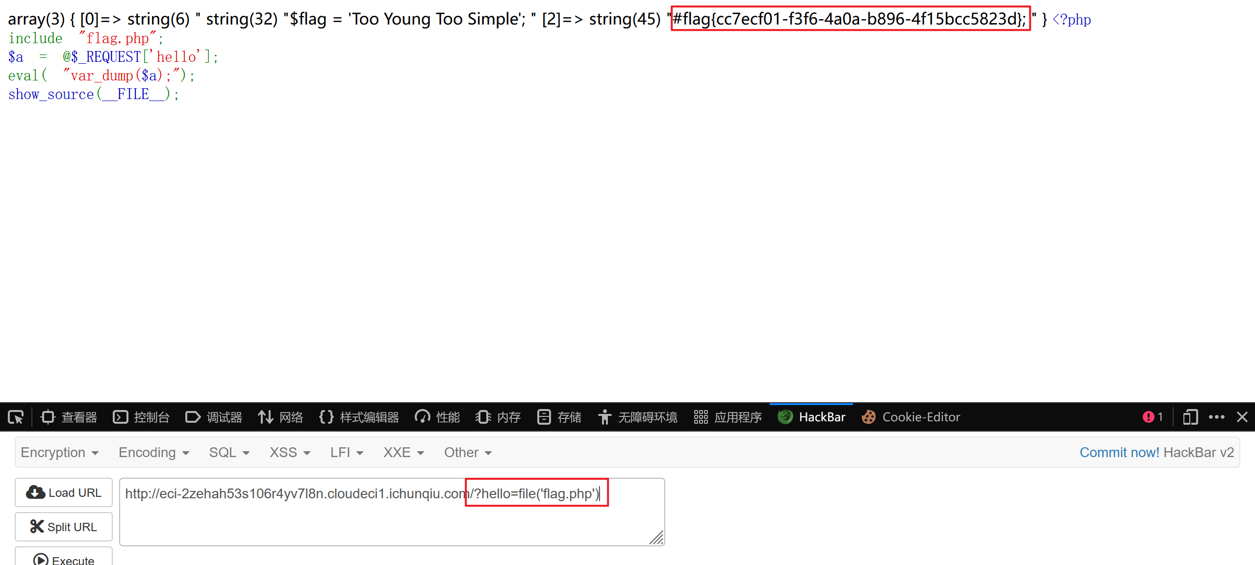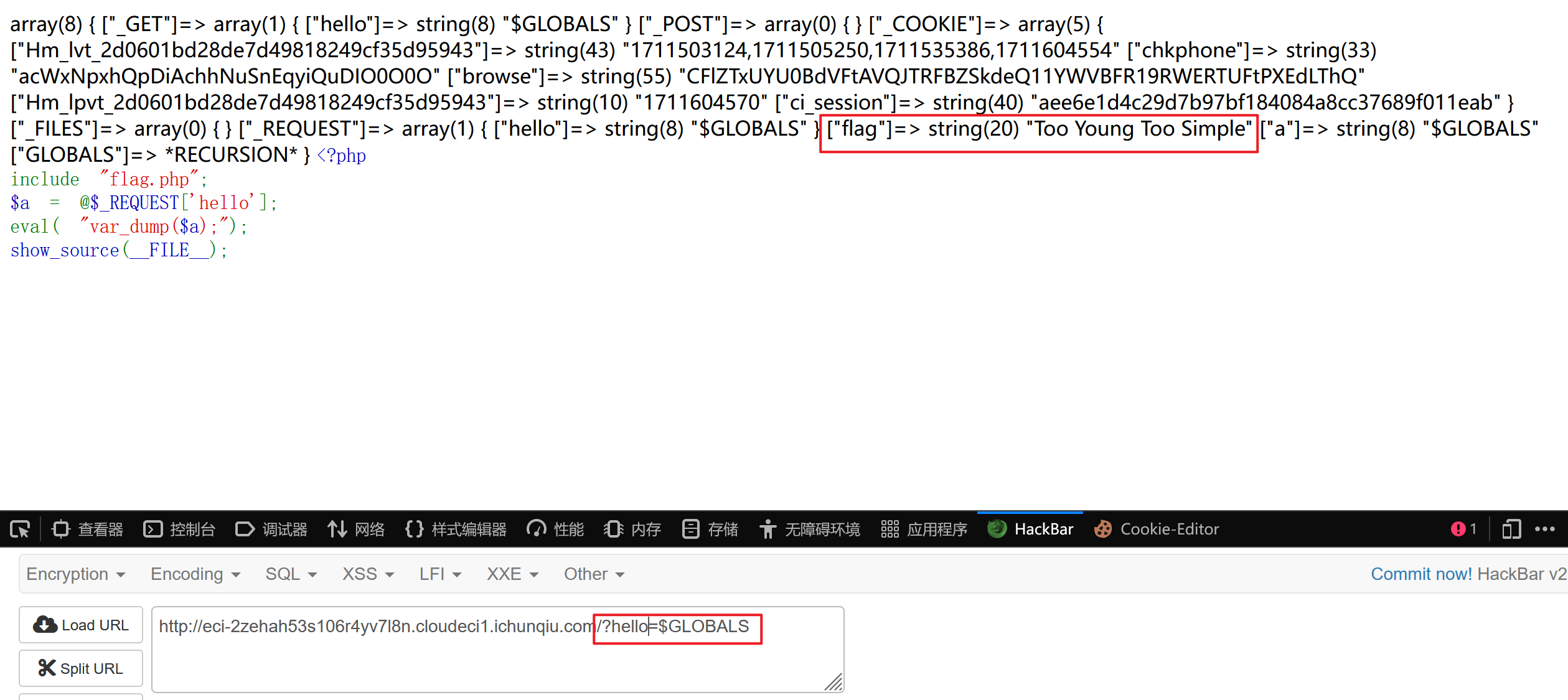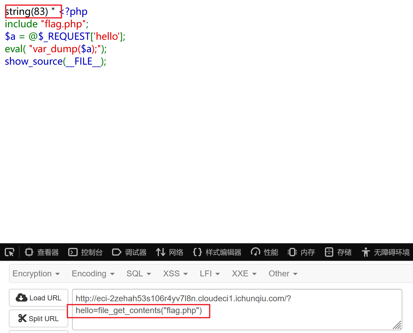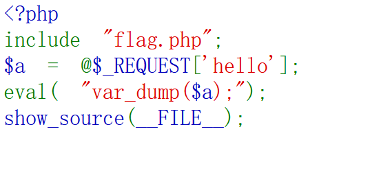 这里我们发现flag的信息并没有在变量中,那我们猜测flag的值应该是藏在flag.php的源码中,分析代码是发现这里也没有设置过滤,就可以通过eval( "var_dump($a);");函数,就有好多种方法来获取flag.php的源码