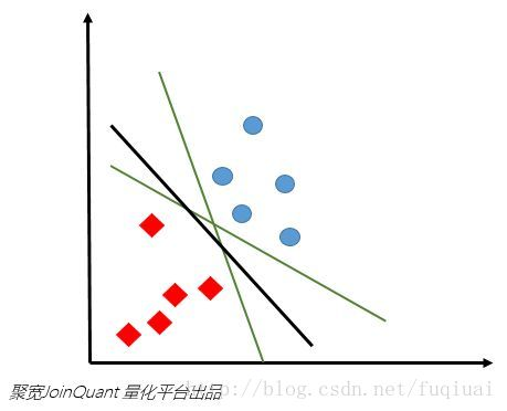 这时候我们就可以看出不同的分离超平面的选择对于分类效果的影响了。有的绿线会将三个点都划归蓝色圆圈,有的绿线会将三个点都划归红色正方形。