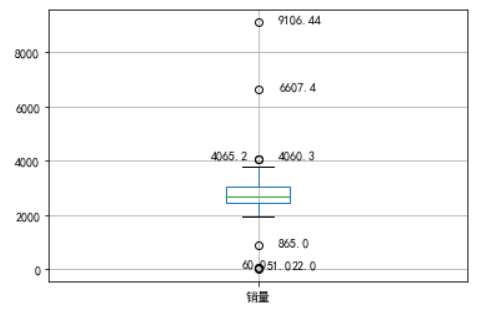 plt.rcParams['font.sans-serif'] = ['SimHei']#指定字体为黑体 plt.rcParams['axes.unicode_minus'] = False#显示负号 plt.figure() p = data.boxplot(return_type='dict')#画箱式图 x = p['fliers'][0].get_xdata()#fliers为异常值标签,get_xdata()与get_ydata()用来获取横纵坐标数组 y = p['fliers'][0].get_ydata() y.sort() #使用annotate添加注释,xy表示标注点坐标, xytext表示注释坐标 for i in range(len(x)): if i > 0: plt.annotate(y[i], xy=(x[i], y[i]), xytext=(x[i]+0.05 - 0.8/(y[i]-y[i-1]), y[i])) else: plt.annotate(y[i], xy=(x[i], y[i]), xytext=(x[i]+0.08, y[i])) plt.show()