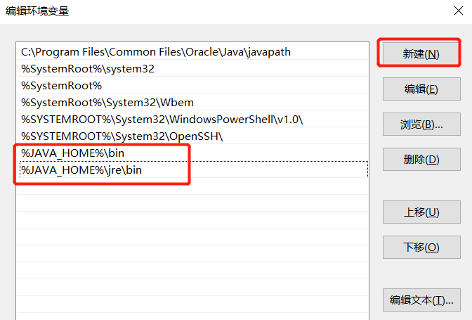 ②新建变量名CLASSPATH,变量值:;%JAVA_HOME%\bin;%JAVA_HOME%\jre\bin