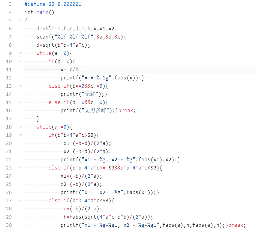 数据处理:表达式:x1=(-b+d)/(2*a);x2=(-b-d)/(2*a); x=-c/b;e=(-b)/(2*a);h=fabs(sqrt(4*a*c-b*b)/(2*a)); 流程结构:while语句中if语句的嵌套