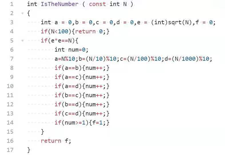本题要求实现一个函数,判断任一给定整数N是否满足条件:它是完全平方数,又至少有两位数字相同,如144、676等