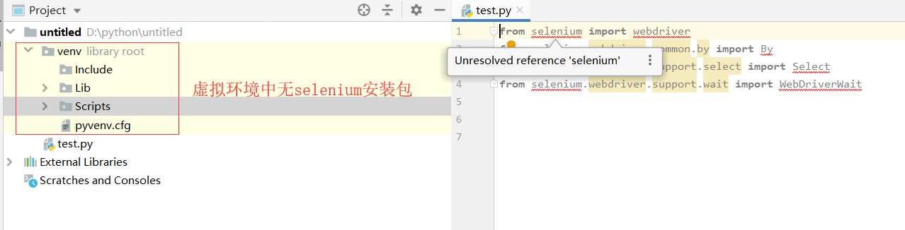 pycharm 新建项目,pycharm自动设置了运行环境为虚拟环境。虽然操作系统中安装了selenium。但是虚拟环境中并没有安装selenium 模块,所以有这个错误提示: