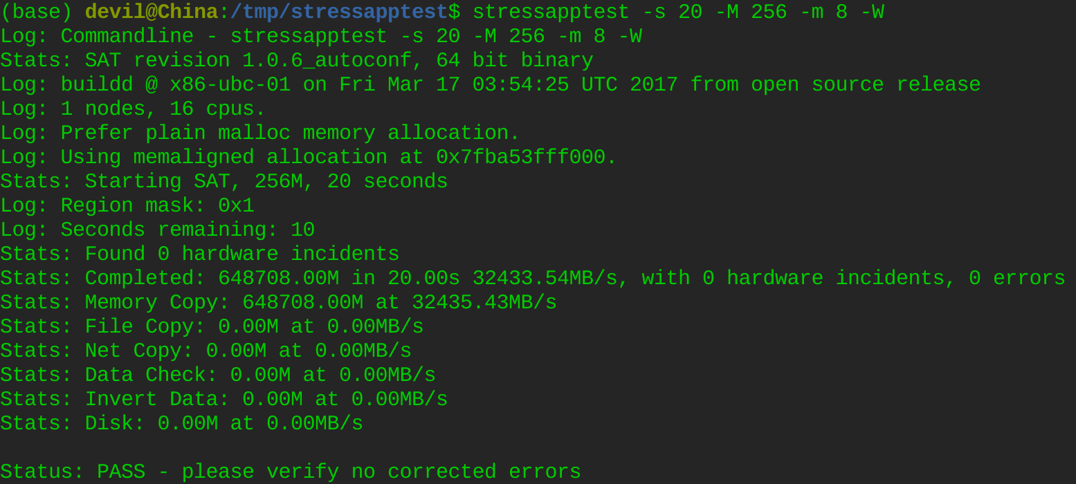 stressapptest -s 20 -M 256 -m 8 -W