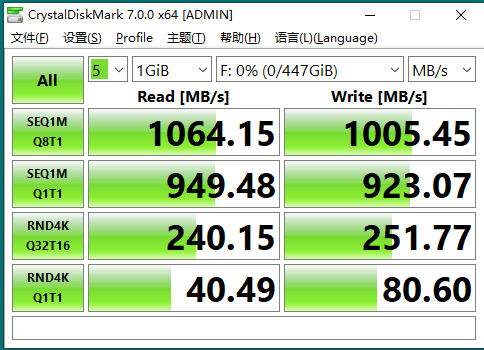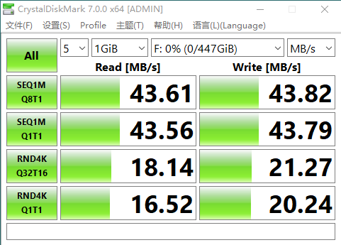 使用CrystalDiskMark做磁盘测速,得到结果: