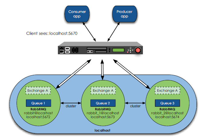 答:cluster 是为了解决当 cluster 中的任意 node 失效后,producer 和 consumer 均可以通过其他 node 继续工作,即提高了可用性;另外可以通过增加 node 数量增加 cluster 的消息吞吐量的目的。cluster 本身不负责 message 的可靠性问题(该问题由 producer 通过各种机制自行解决);cluster 无法解决跨数据中心的问题(即脑裂问题)。另外,在cluster 前使用 HAProxy 可以解决 node 的选择问题,即业务无需知道 cluster 中多个 node 的 ip 地址。可以利用 HAProxy 进行失效 node 的探测,可以作负载均衡。下图为 HAProxy + cluster 的模型。