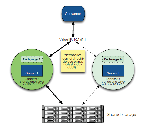 另一种模型为两台共享存储的 RabbitMQ server + keepalived ,其中两个 server 的状态分别为 active 和 cold-standby 。该模型的特点为:两台 server 基于共享存储可以做到完全恢复,要求必须基于完全相同的 RabbitMQ 版本。如下图所示