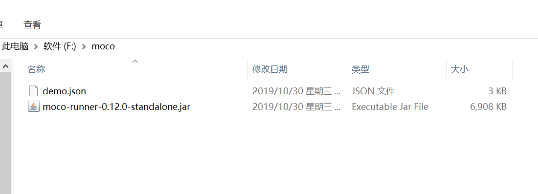 - 安装moco,将 moco-runner-0.12.0-standalone.jar 和接口配置json文件放在同一目录下,如图:
