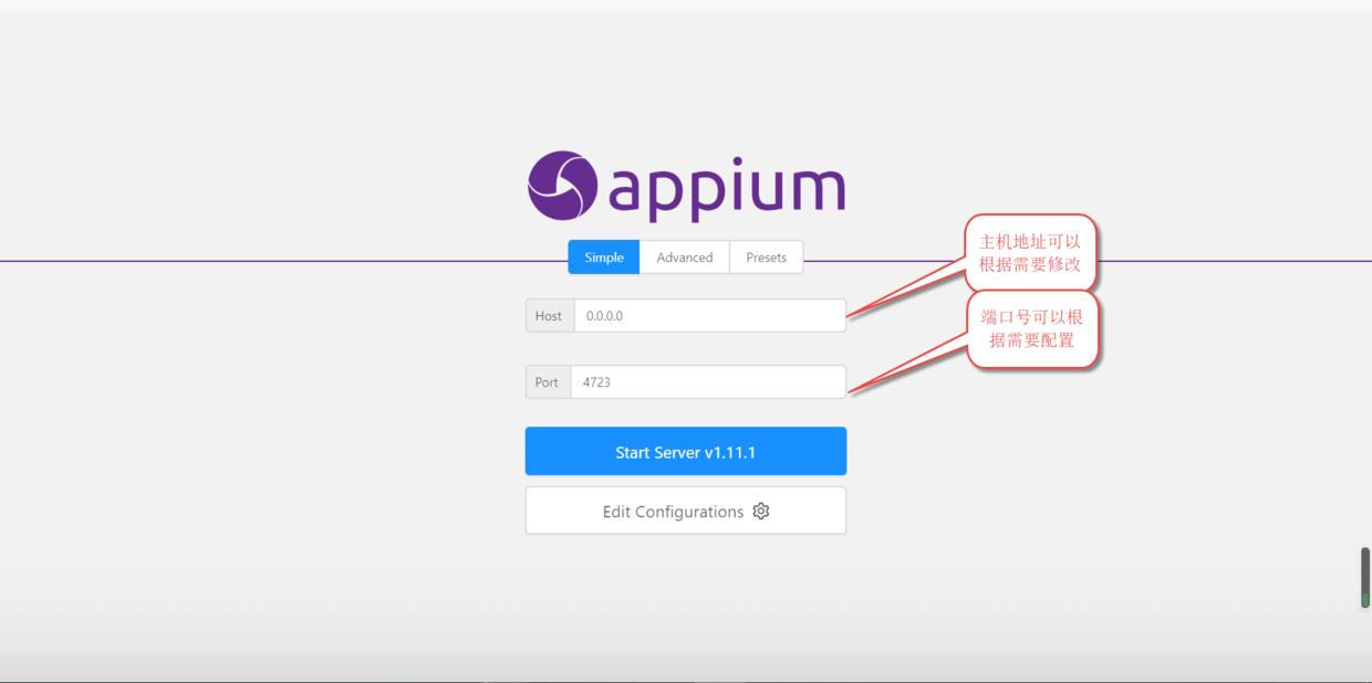 在simple界面可以对主机地址和端口后进行简单配置,还可以在advanced中对日志级别、日志保存路径等进行设置。