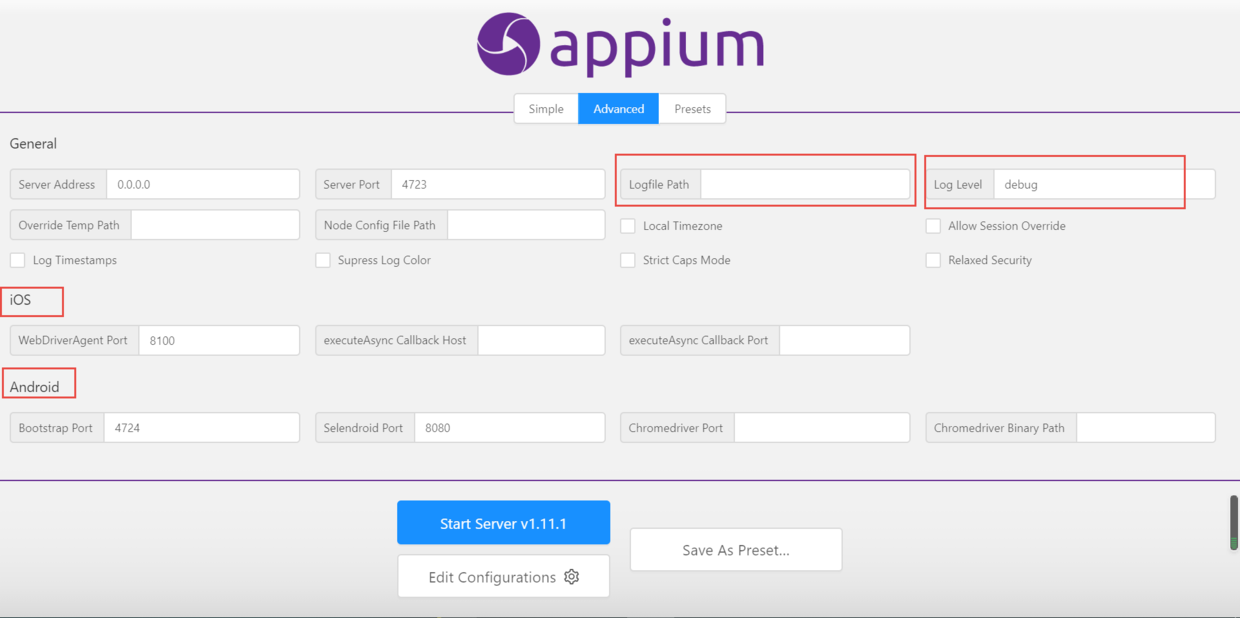 这有一个 Appium 服务器的图形界面封装可以下载,它适用于任何平台。它打包了 Appium 服务器运行需要的所有东西,所以你不需要为 Node 而烦恼。它们还提供一个 Inspector 使你可以查看应用程序的层级结构。这在写测试时可以派上用场。