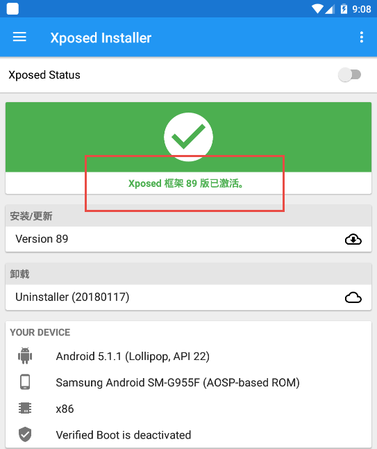 安装完毕后,重新打开xposed软件,显示已经成功激活。