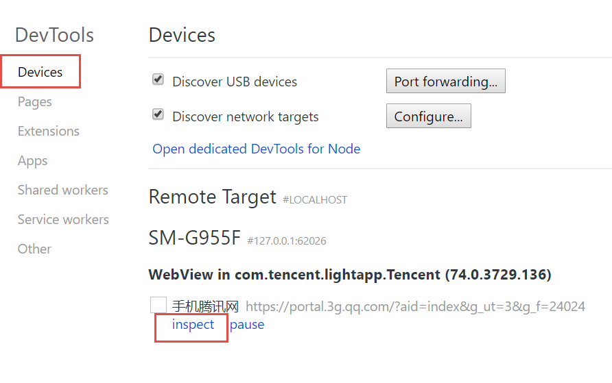 正常情况下,此时直接打开Chrome浏览器,输入网址:chrome://inspect/#devices,然后在手机上打开需要测试的App,接着等待Chrome浏览器获取信息,点击“inspect”,就可以获取当前App页面的定位元素信息。但是,无法获取。