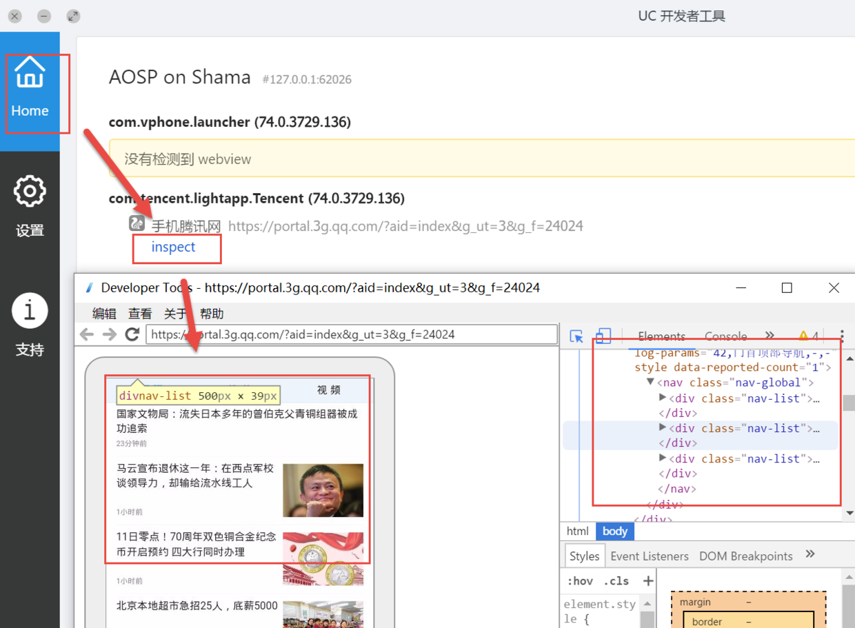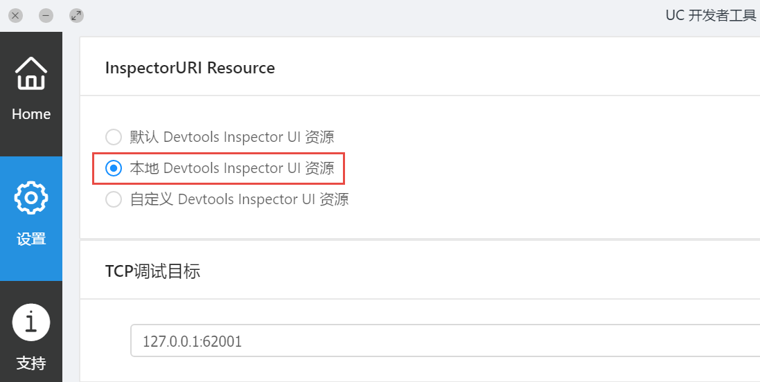 安装完毕后,打开uc-devtools,然后在“设置”中将inspectorURL Resource选中为“本地Devtools inspector”。